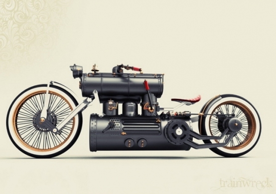 上圖這輛名為T(mén)rain Wreck Bike Concept的超凡脫俗摩托車(chē),它的特色就是充滿(mǎn)著Steampunk(蒸氣龐克)風(fēng)格。這位工業(yè)設(shè)計(jì)師的主要目標(biāo)是要把大家?guī)Щ卣魵夤I(yè)時(shí)代。