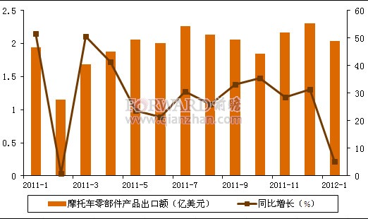 2011年1月-2012年1月我國摩托車零部件產(chǎn)品出口額及同比增速(單位:億美元,%)