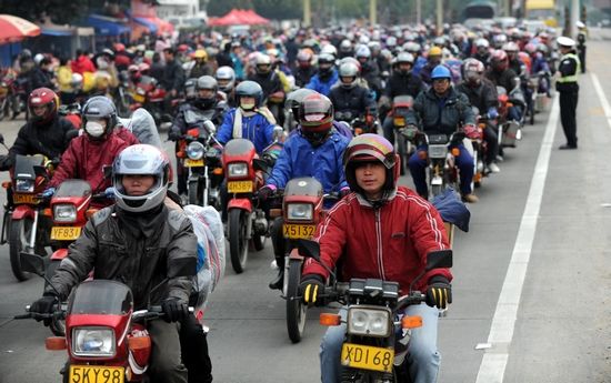 每年春節(jié),10萬打工者組成的“摩托大軍”從珠三角出發(fā),沿國道向西北進(jìn)發(fā),返回廣西、貴州、湖南等家鄉(xiāng)過年。
