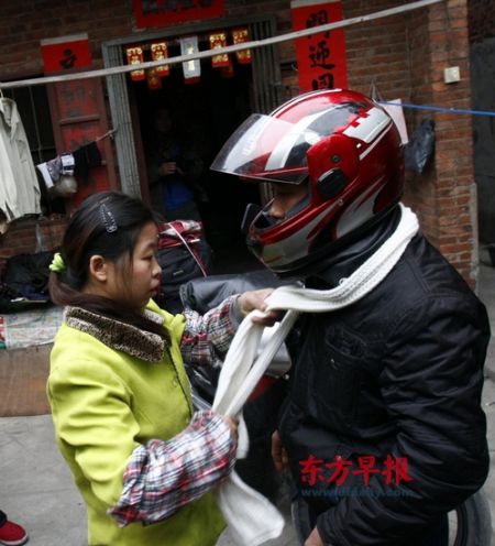1980年出生的汪正年很愛開玩笑,經(jīng)過改裝,他的摩托車亮出的是綠光,還外載了一只音箱。汪正年也在工地做泥水工,妻子彭雙芹1988年出生,在鞋廠上班。出發(fā)前汪正年和堂哥汪長軍夫婦前往商場選購年貨,一下午下來,他們僅買了三雙襪子,10元錢。汪正年說,如果帶上堆積如山的行李,摩托車跑遠(yuǎn)路十分危險(xiǎn)。