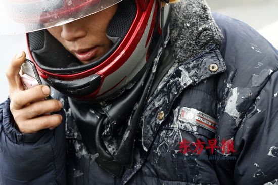 中午時(shí)分,汪正年和魯朝軍把車停靠在焦溪鎮(zhèn)的大橋上,等待遠(yuǎn)遠(yuǎn)落在身后的汪長軍。此時(shí),汪正年和魯朝軍的上衣一大攤面積出現(xiàn)結(jié)冰,車頭和頭盔也都覆蓋了一層冰,輕輕拍打,冰塊脫落一地。