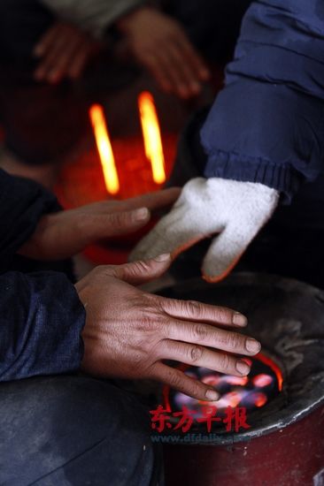 這時(shí),天空飄起了小雪,氣溫在零攝氏度以下,魯朝軍說當(dāng)天是一路以來最冷的一天了。他和親人找了一家快餐店,店不大,但可以烤火,這讓他們很知足。身邊柴火跳躍的火焰映紅了他們的臉,他們每人叫了一碗4元的面條,狼吞虎咽般地匆匆吃完,立即感到冰冷的身體恢復(fù)了溫暖,有人解開了棉衣。