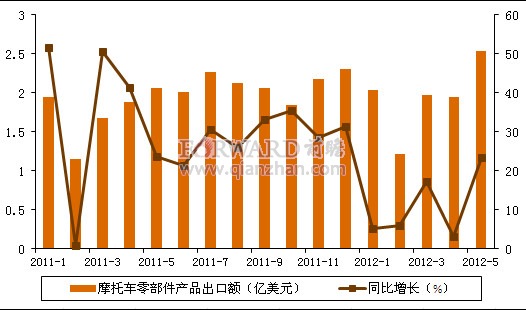 2011年1月-2012年5月我國摩托車零部件產(chǎn)品出口額及同比增速(單位:億美元,%)