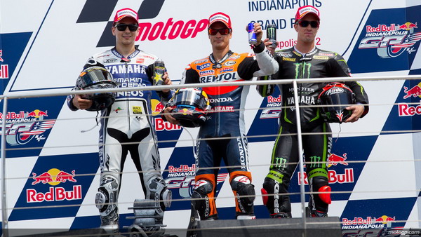 北京時間8月20日凌晨,2012年MotoGP印第安納波利斯站正賽結束,本田車手達尼-佩德羅薩以46m39.631s獲得冠軍,雅馬哈車手豪爾赫-洛倫佐落后10.823s屈居第二,Tech 3車手阿德里安-多維茲奧佐位列第三。