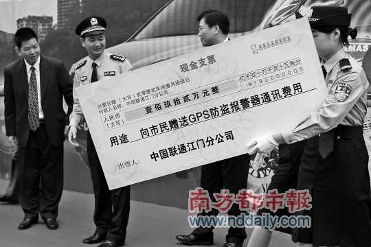 在儀式上,蓬江商會(huì)負(fù)責(zé)人向蓬江公安分局贈(zèng)送了48萬元用于購置1600套G PS防盜報(bào)警器,中國聯(lián)通江門分公司以話費(fèi)的形式捐贈(zèng)了192萬元,提供給1600名摩托車車主。