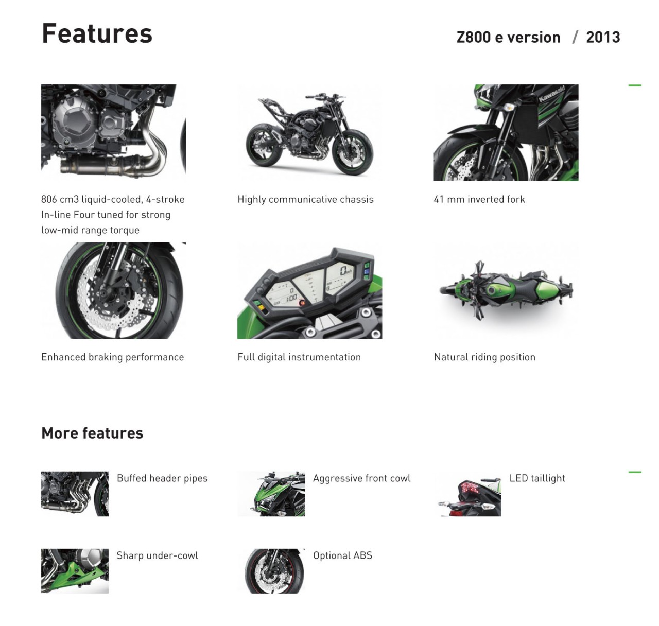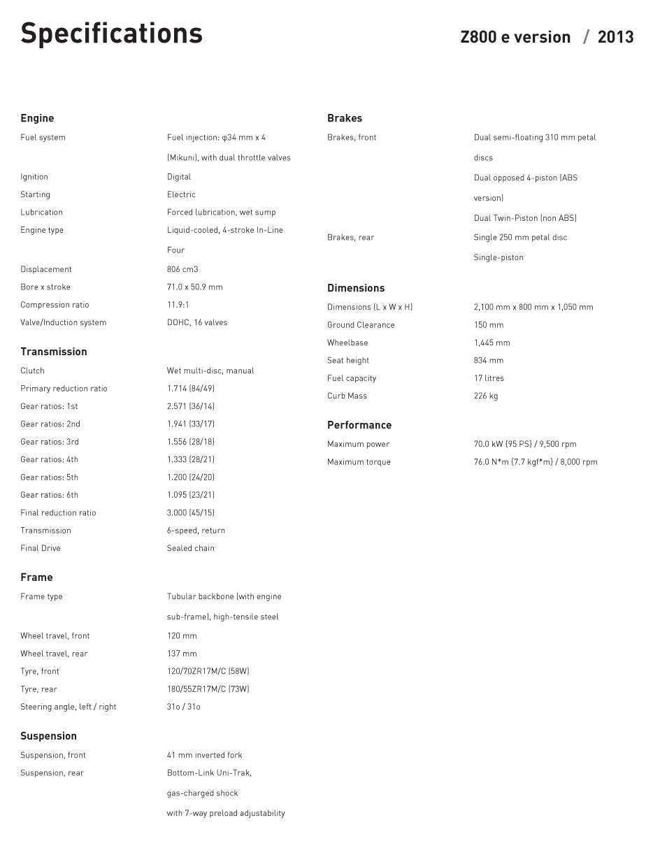 Kawasaki Z800本是廠方的最新產(chǎn)品,但這部采用了水冷四沖程直列四汽缸、DOHC每汽缸四汽閥發(fā)動(dòng)機(jī)的運(yùn)動(dòng)型街車,最大馬力輸出達(dá)到了83kw,229公斤的整備重量也令其功率/重量比達(dá)到0.362,持有最高準(zhǔn)駕車型要求的A類駕駛證才可以合法駕駛Z800,明顯地難以向更大的消費(fèi)群體進(jìn)行銷售。