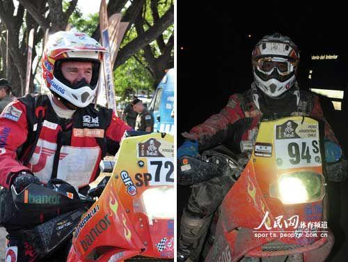 核心提示:2013年1月12日,中國金城車隊(duì)車手帕布洛(左)和魏廣輝(右)完成達(dá)喀爾摩托車組馬拉松賽,抵達(dá)阿根廷圖庫曼大營。人民網(wǎng)阿根廷