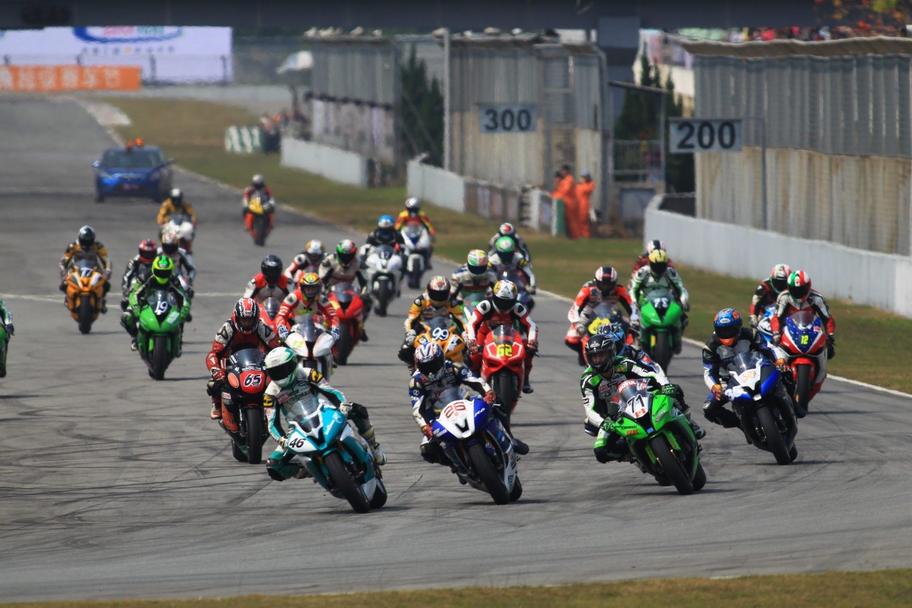 裁判哨音響起,人流退出賽道,只剩下賽車和車手。比賽馬上就要開始了。暖胎圈,車流有序的在做著蛇形動作。雖然珠海3月的溫度較高,有陽光的地方已經(jīng)接近30度,但這個溫度對于摩托車輪胎來說,顯然還沒有達(dá)到最佳的工作溫度,充分的暖胎非常有必要。根據(jù)排位賽成績,Dan Kruger第一,黃世釗在旁邊位列第二,李鄭鵬第三。三人占據(jù)了第一排的位置。不過因為摩托車車身小、車與車之間的距離近,而這些超級摩托車馬力又很大,所以比賽中位置變化可以用瞬息萬變來形容。前面的車手并沒有絕對的優(yōu)勢。