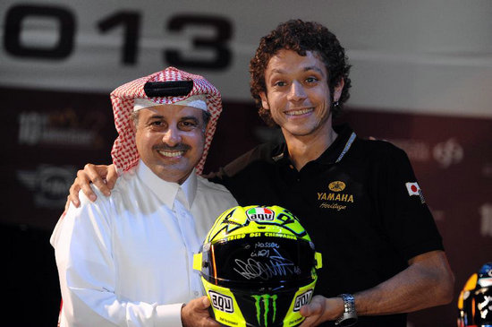 雅馬哈車隊意大利車手羅西(右)將簽名的頭盔贈送給卡塔爾摩托車運動協(xié)會主席納賽爾。