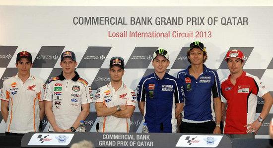 2013年4月3日卡塔爾魯塞爾國(guó)際賽道,來(lái)自Repsol Honda Team車(chē)隊(duì)西班牙車(chē)手馬奎茲、LCR Honda MotoGP車(chē)隊(duì)德國(guó)車(chē)手斯特凡、Repsol Honda Team車(chē)隊(duì)西班牙車(chē)手佩德羅薩、雅馬哈車(chē)隊(duì)西班牙車(chē)手洛倫索與意大利車(chē)手羅西和杜卡迪車(chē)隊(duì)美國(guó)車(chē)手海登(自左向右)共同出席2013年世界摩托車(chē)錦標(biāo)賽首站賽新聞發(fā)布會(huì)并合影。揭幕站將于4月7日在卡塔爾魯塞爾國(guó)際賽道打響。
