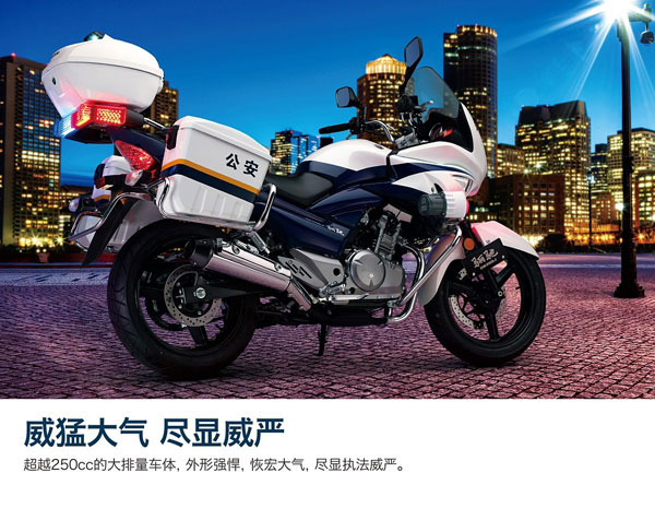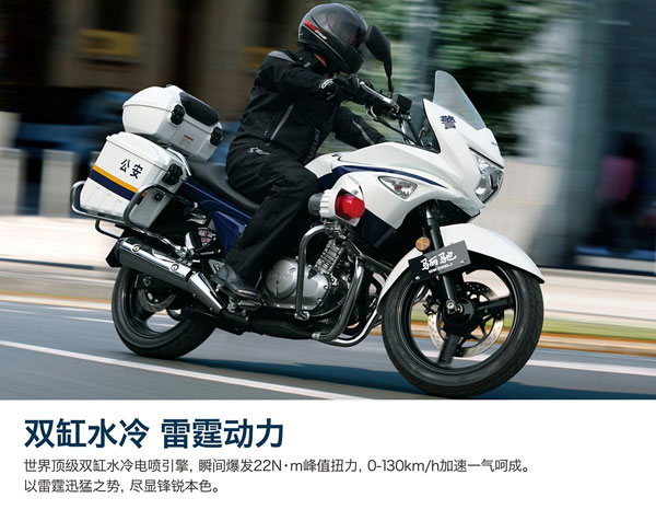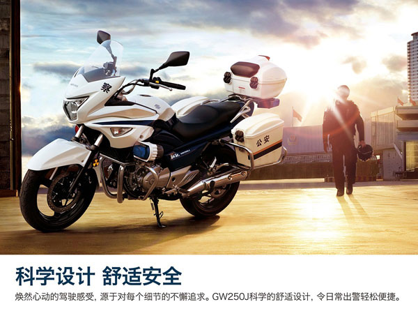 驪馳GW250J,專為警務(wù)需求設(shè)計(jì):超越250cc的大排量車體,恢宏大氣,威風(fēng)凜凜;搭載250cc雙缸水冷電噴引擎,電起動(dòng)一觸即發(fā),0-130km/h加速一氣呵成,振動(dòng)微乎其微,特別適合高溫天氣下連續(xù)低速行駛,及夜晚長(zhǎng)時(shí)間怠速狀態(tài)下執(zhí)行公務(wù)。結(jié)合獨(dú)有的直立騎乘姿勢(shì)及世界一流的配置和專用警具,不僅能夠提供長(zhǎng)時(shí)間乘騎的舒適性,更能有效保證警員的安全,尤其適合警衛(wèi)開(kāi)道、交通巡邏和公安、司法、法院、檢察、國(guó)安等機(jī)關(guān)警務(wù)人員全天候執(zhí)行公務(wù)。