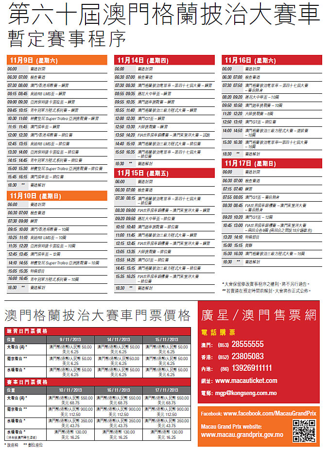 核心提示:第60屆澳門格蘭披治大賽車暫定賽程程序
