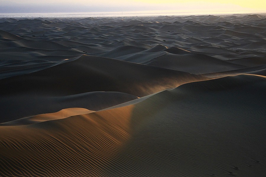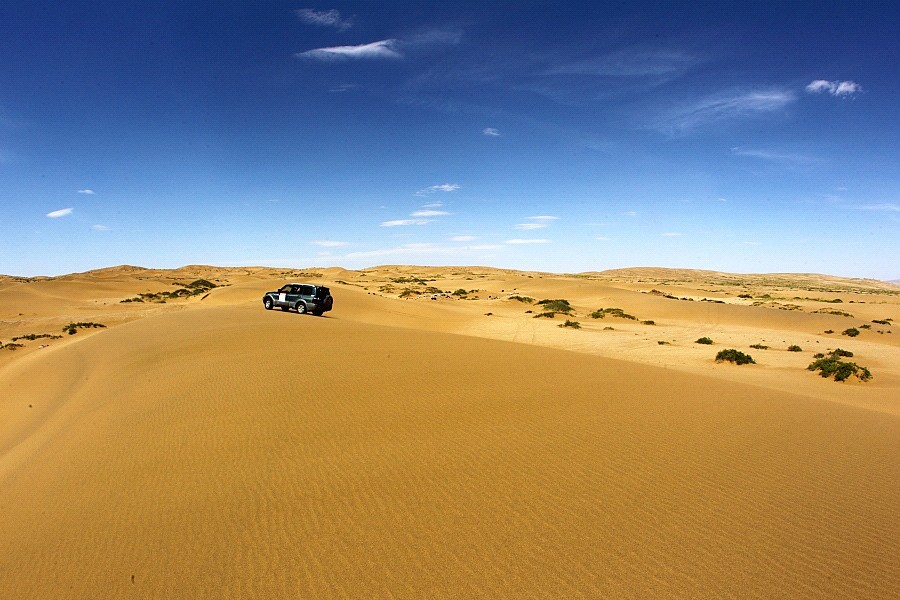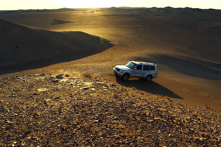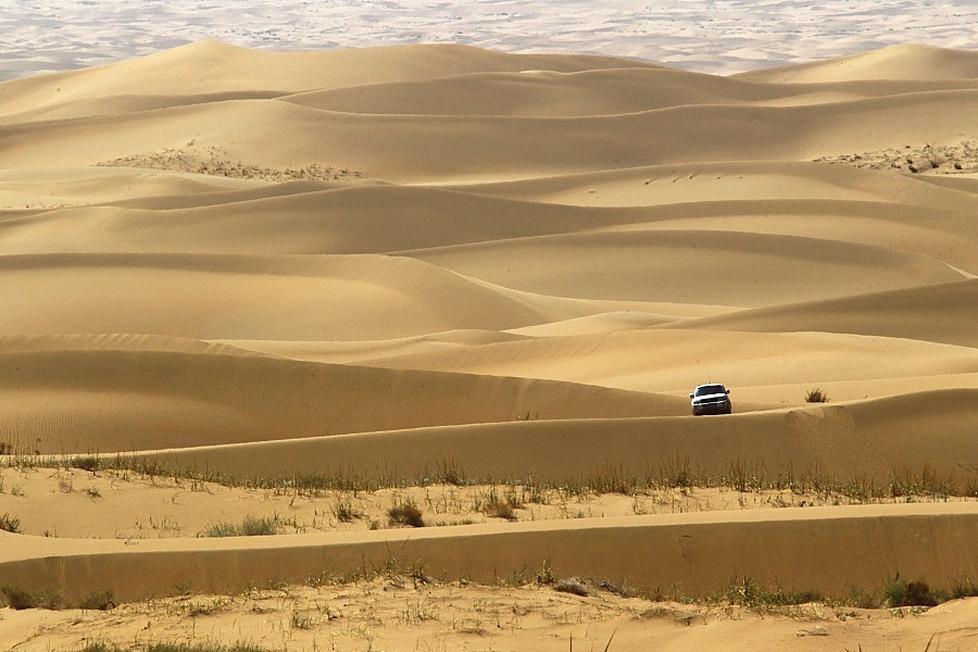 所處的沙漠實在是太大,大得如同在大海中,車就如同一泛小舟,隨沙峰的起伏而搖晃漂蕩。