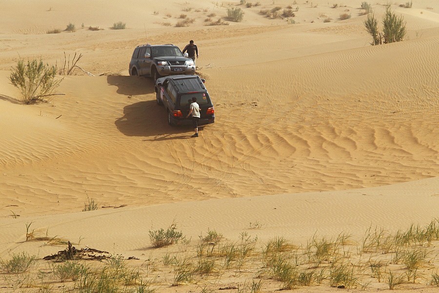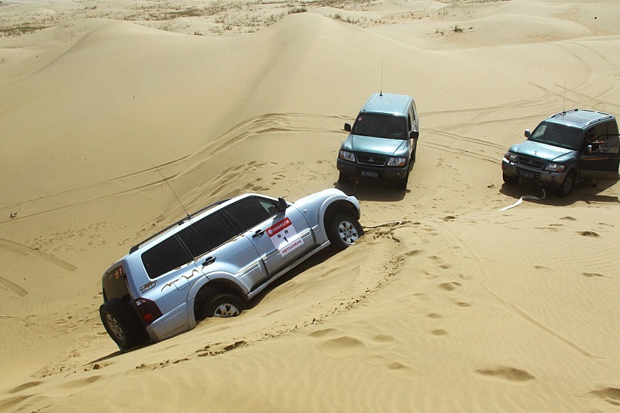 草場(chǎng)、大戈壁的路還相對(duì)好找,畢竟有車轍有方向可尋,但在沙漠中尋路卻并不好找,所費(fèi)的體力也就更大,每天的進(jìn)程也短。原因是沙漠的地型可變性太大,有強(qiáng)烈的起伏與落差,充滿著不可預(yù)知的危險(xiǎn)性。而且,在本次勘路中我們所使用的是民用版的三菱V73\V77及一臺(tái)負(fù)責(zé)背給養(yǎng)的LC100。雖然勘路組的成員常年往沙漠中鉆來鉆去,但為了確保安全,幾臺(tái)車在離京前都統(tǒng)一加裝上防滾架。車身重,動(dòng)力弱,因此陷沙也就成了常有的事。在這次勘路期間所走過的沙漠——巴丹吉林沙漠因連續(xù)舉辦幾年的比賽,大家走起來還尚算順利,但在騰格里沙漠中,則困難重重??甭分械囊幻贻p小伙就因暈車,一邊挖沙子,一邊吐,一鏟沙子一口胃液,苦不堪言。