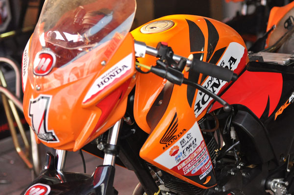 相比西安站,五羊-本田車隊的狀態(tài)明顯回勇,并且在本站車隊獲得了贊助商天豐鋰電的全力支持。替補受傷車手周盛俊杰出場的車手杜邦上場,其表現(xiàn)突出并在比賽中發(fā)揮的游刃有余,令人敬佩。在廠商杯150cc組排位賽中陳遠航以單圈最快圈速1分17秒,刷新了去年排位賽的最快單圈紀錄。8月9日下午高溫之下的廠商杯150cc組第一回合比賽,車手們面臨高溫考驗,跑完全程無疑需要比平常更強的體力支撐和意志。開場陳遠航充當領(lǐng)頭羊,隊友杜邦以及王孝源緊追其后,你追我趕,最終車手王孝源獲得第一,杜邦第二,而陳遠航因賽車出現(xiàn)小故障暫時排名第六?!?/p>