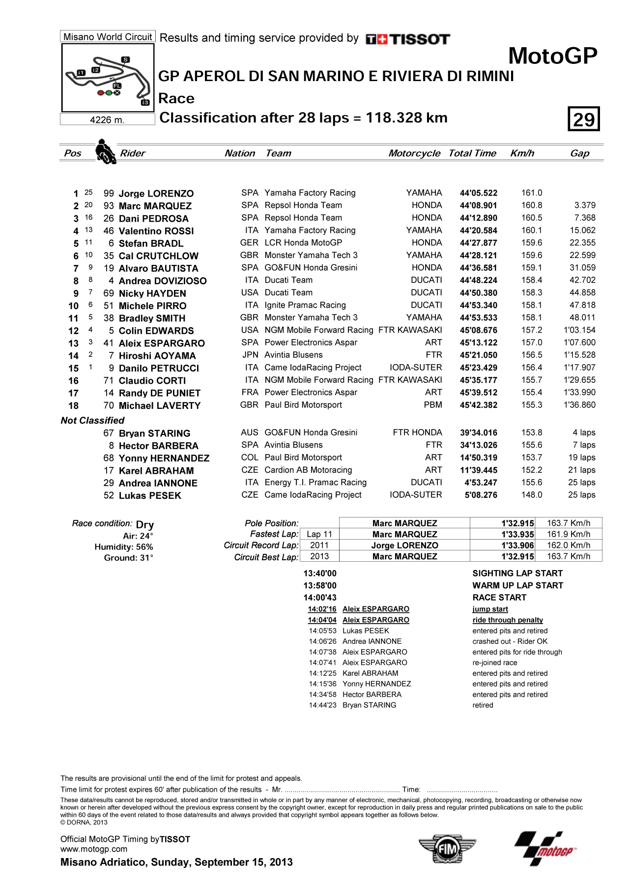 2013年MOTOGP圣馬力諾站-MotoGP成績(jī)表