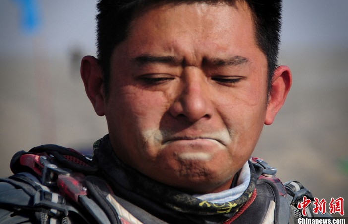 車手雖然有頭盔,但沙土還是沾滿了車手的嘴。