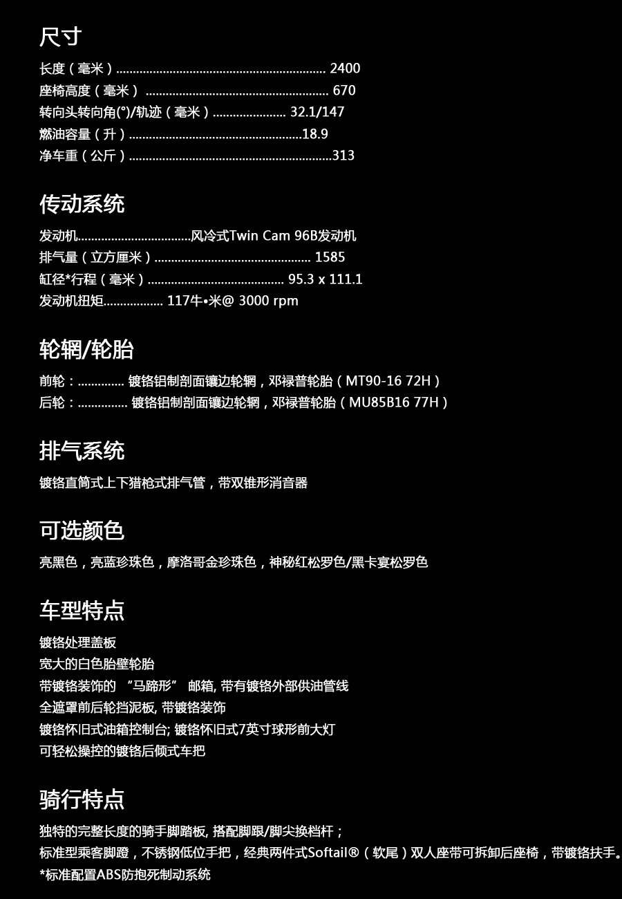 哈雷戴維森 2014 Sotail® Deluxe豪雅軟尾 廠商建議零售指導(dǎo)價(jià)(本價(jià)格為基本價(jià)格)¥ 299,000起