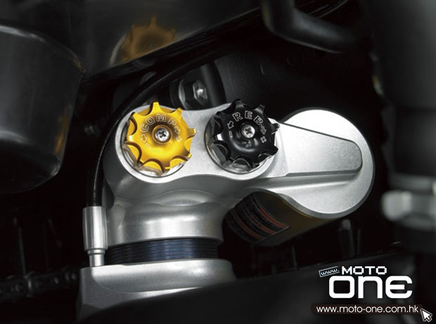 這臺以O(shè)hlins命名的特別版,故名思義前后均是改用了Ohlins的避震系統(tǒng),取代原裝Showa避震,而尾避震更是用上頂級的TTX 39全調(diào)校單筒避震,并附有預(yù)載遙遠(yuǎn)旋鈕,方便騎士調(diào)校。據(jù)廠方新聞稿講,新避震的吸震效果明顯加強(qiáng),使行車穩(wěn)定性得到明顯提升,并且有減磅及體積細(xì)的好 處。
