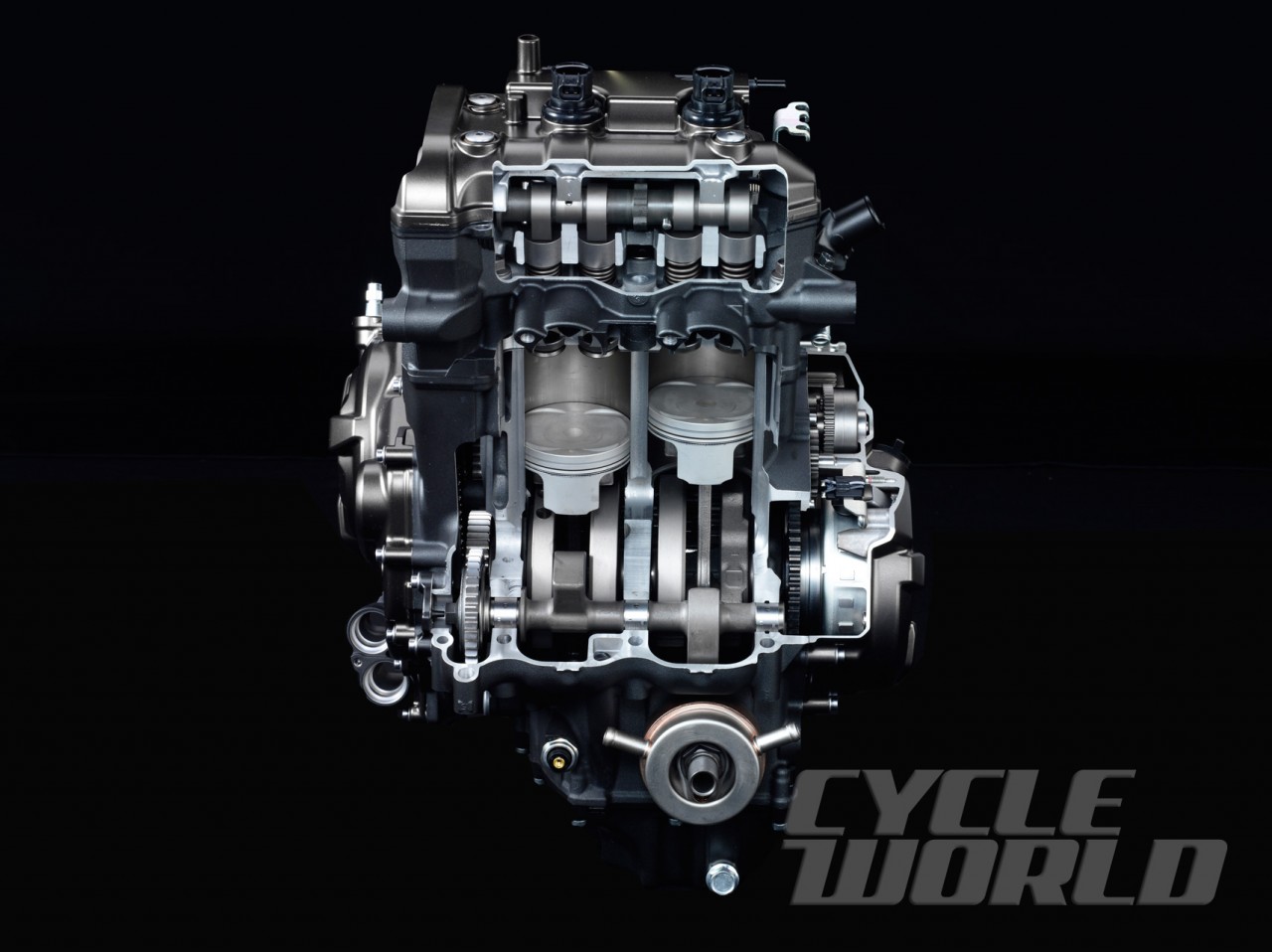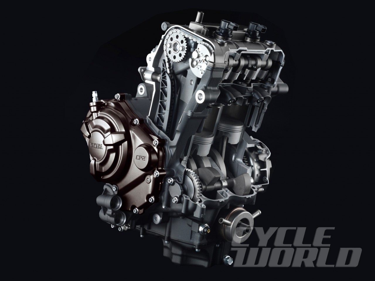 說(shuō)回MT-07,外型當(dāng)然有一點(diǎn)大哥MT-09的風(fēng)格,但規(guī)格卻有明顯的分野,其核心使用全新開發(fā)的水冷直列2汽缸引擎,排氣量是689cc,馬力輸出是74.8ps,但同樣采用源自MotoGP M1的十字曲軸概念進(jìn)行點(diǎn)火,讓車輛在加減速時(shí)更暢順地行車,使騎士容易地掌握車輛的性能,但車輛的波箱外殼及配色極具V-MAX的外型。