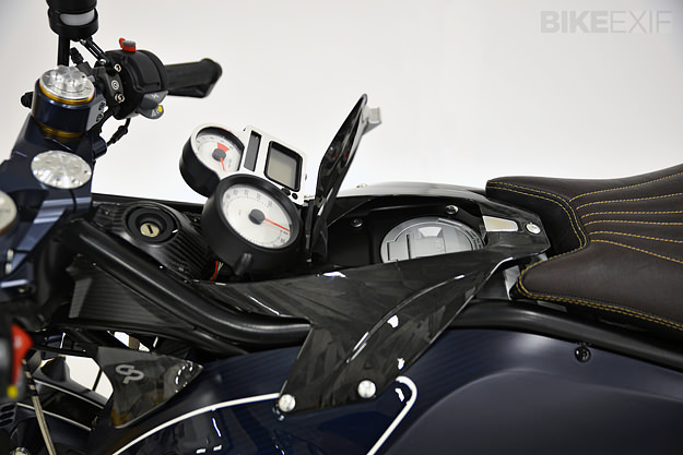 這款DIVA不同于多數的R1200車型,靈感來自于10、20年代的老款摩托車,在車身上你完全看不到傳統的油箱,歸功于水平對置的對向引擎配置,給予了足夠的空間,把油箱藏在車架與引擎中間的空間,造就出這樣一幅完美協調的車身線條。