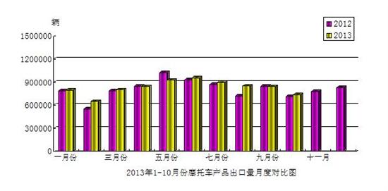 2013年10月份,摩托車產(chǎn)品出口73.90萬輛,比上月下降了12.26%,比去年同期增長了4.28%,出口金額3.93億美元,與去年同期增長了4.62%。