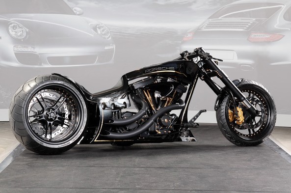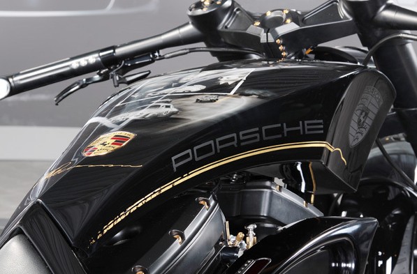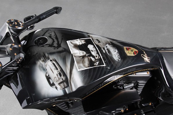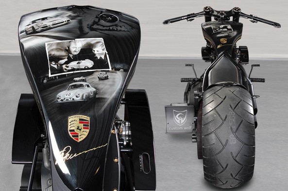 改裝公司Custom Wolf為紀念保時捷公司,制造一輛黑酷機車,全車遍布保時捷的圖像。發(fā)動機使用了來自S&S的動力單元及Harley變速箱,巨大的剎車卡鉗取自川崎ZX10R。