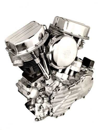 1936年哈雷推出了EL型摩托車,動(dòng)力裝置就是大名鼎鼎的“拳頭”(Knucklehead)發(fā)動(dòng)機(jī)。這臺(tái)V形雙缸排量高達(dá)1000ml,最大的特點(diǎn)是采用了頂置氣門(OHV)。由于氣門推桿和汽缸頭,構(gòu)成拳面形狀,且動(dòng)力比起以前的側(cè)置氣門V形雙缸彪悍得多,因此獲得“拳頭”的美稱。頂置氣門V形雙缸在低轉(zhuǎn)速時(shí)具有強(qiáng)大的扭矩,且能夠通過(guò)調(diào)整V形雙缸的夾角以獲得不同的震動(dòng)節(jié)奏和排氣聲浪,具有很強(qiáng)的個(gè)性,因此即使后來(lái)研發(fā)了先進(jìn)的頂置凸輪軸(OHC)配氣機(jī)構(gòu),OHV仍然沒(méi)有退出歷史舞臺(tái)。直到目前,哈雷絕大多數(shù)車型搭載的仍然是OHV發(fā)動(dòng)機(jī),因此這是是哈雷歷史最悠久、運(yùn)用最廣泛的動(dòng)力裝置,生產(chǎn)壽命超過(guò)70年,至今仍長(zhǎng)盛不衰!