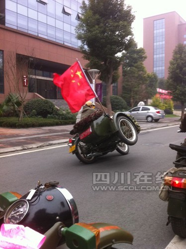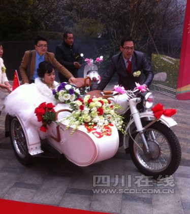 中午12時,11輛裝扮一新的摩托車載著新人前往酒店,一路上行人紛紛駐足觀看,“太拉風(fēng)了。”新郎官王先生一邊駕車一邊向行人招手,現(xiàn)場氣氛十分熱烈。據(jù)了解,王先生是一名吉它教師,平時迷戀國產(chǎn)的長江750摩托車,所以結(jié)婚時就邀請摩托車愛好者一起用摩托車作為婚車迎親。新娘于小姐是華西醫(yī)院的一名醫(yī)生,坐在摩托車上表示,“迎親很創(chuàng)意,比坐奔馳車還幸福”。