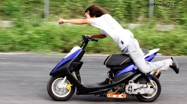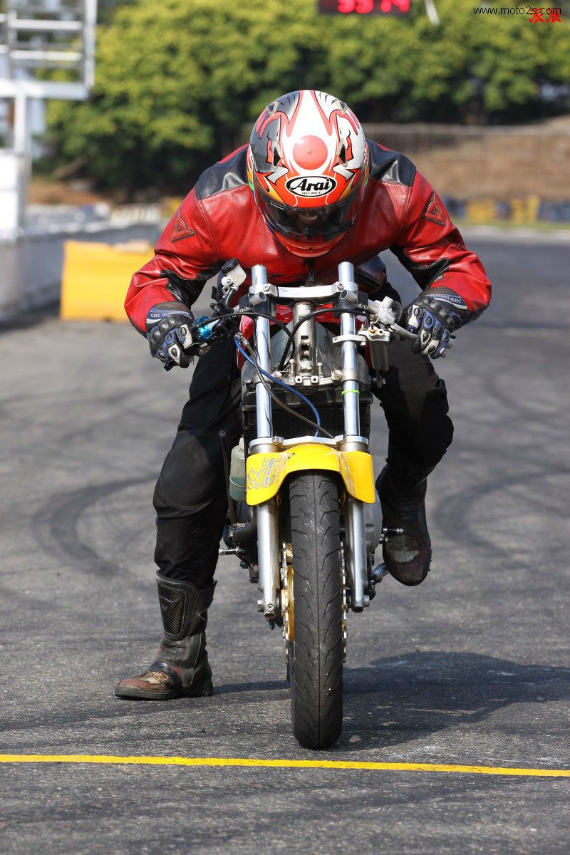 大功率的踏板車(chē),為了讓前輪不浮舉,車(chē)手在起步時(shí)大多將身體盡量前傾,以求使用最大的油門(mén)開(kāi)度瞬間沖出。若是壓不住車(chē)頭,只要前輪一離地,就得收油,在這一上一下的時(shí)間,就得損失0.3-0.5秒。而其式車(chē)由于無(wú)法像踏板車(chē)一樣以身體將車(chē)頭壓住,所以更要注意前輪離地的問(wèn)題,起步時(shí)應(yīng)全程保持半離合器讓動(dòng)力不要過(guò)度接合,以獲得最佳的加速。另外由于排量叫小的擋車(chē)一檔速度過(guò)低,大約在20米處就需要準(zhǔn)備打進(jìn)二檔,為了讓換檔更快,起步時(shí)可先將左腳欲先放在準(zhǔn)備換檔的位置。