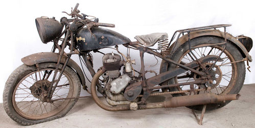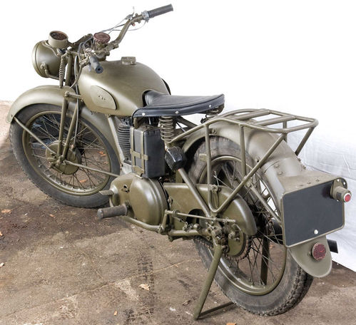 該車于上世紀(jì)30年代制造,采用一臺4沖程350ml發(fā)動機(jī),最高速度90km/h。這輛車的保存狀態(tài)不好,亟待修復(fù),發(fā)動機(jī)已經(jīng)無法工作,啟動電機(jī)也缺失了。準(zhǔn)確制造年份不詳,制造商銘牌缺失。車架編號180.18-112,發(fā)動機(jī)編號144576。