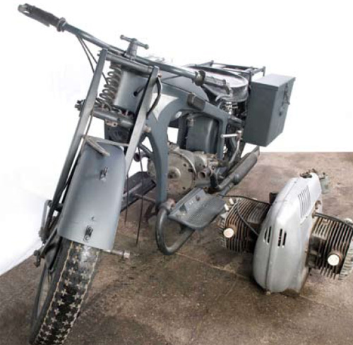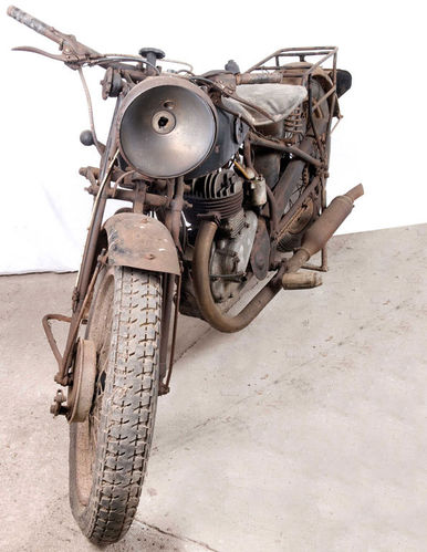 尊達(dá)普公司曾在1934~1938年間生產(chǎn)過軍用型尊達(dá)普K800,其正式名稱為K800W。K800W的車架與尊達(dá)普K500完全相同,整車全重212kg,表面處理相當(dāng)考究。該拍品并不完整,亟待修復(fù)?;推鞑皇窃b品。車體后部帶兩個金屬儲物箱。車軸編號1071A3。由于總產(chǎn)量只有區(qū)區(qū)550輛,尊達(dá)普K800屬于相當(dāng)罕見的摩托車藏品,雖然該車狀態(tài)不好,但對于那些有興趣和能力修復(fù)的朋友,還是非常有價值的。