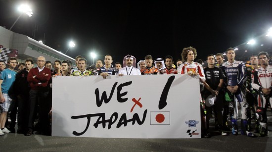 核心提示: 3月20日,在卡塔爾魯塞爾國際賽道進(jìn)行的世界摩托車錦標(biāo)賽MOTOGP組別決賽前,參賽選手和官員一道手舉標(biāo)語為日本地震海嘯遇難者默