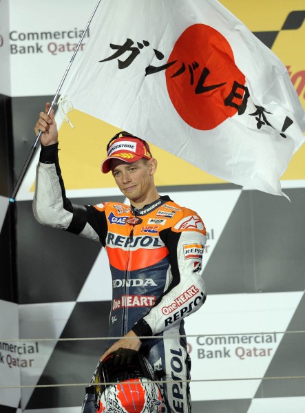 3月20日,本田車隊(duì)澳大利亞選手斯通納在頒獎(jiǎng)儀式上舉旗為日本地震海嘯災(zāi)民加油。當(dāng)日,在卡塔爾魯塞爾國際賽道進(jìn)行的世界