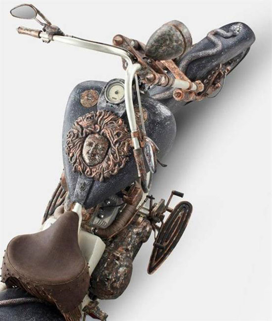 除了黃金制作的車架,藝術氣息也讓這臺摩托車十分特別。Telli說為了不讓黃金車架看起來太耀眼俗氣,比如中東的黃金車,使用了一種綠色銹蝕工藝讓這臺摩托有了一定的滄桑感,所以請大家把護目鏡摘下繼續(xù)用藝術的目光欣賞她。