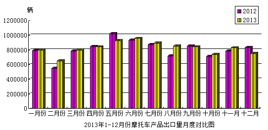 2013年12月份,摩托車產(chǎn)品出口75.00萬(wàn)輛,比上月下降了9.56%,比去年同期下降了10.04%,出口金額4.04億美元,與去年同期下降了8.33%。