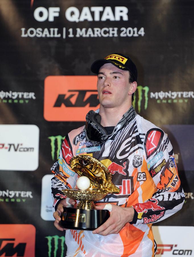 核心提示: 3月1日,荷蘭車手赫林斯在領(lǐng)獎(jiǎng)臺(tái)上展示獎(jiǎng)杯。 當(dāng)日,在卡塔爾魯塞爾國際賽道進(jìn)行的2014年世界摩托車越野錦標(biāo)賽揭幕戰(zhàn)卡塔爾