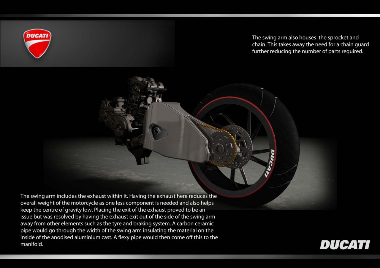VR46 Concept不僅外型精悍,設(shè)計(jì)上也相當(dāng)大膽,首先仔細(xì)觀察就會(huì)發(fā)現(xiàn)沒有排氣管的設(shè)計(jì),不像1199是把排氣管放在引擎與變速箱底部。設(shè)計(jì)師大膽的將排氣管與后搖必整合在一起,通過碳纖維的材質(zhì),將排氣管直接納入鋁合金搖臂內(nèi),排氣孔直接于搖臂側(cè)面排出。而考量到精簡(jiǎn)的單搖臂設(shè)計(jì),該搖臂上還需要同時(shí)具備后牙盤、剎車制動(dòng)系統(tǒng)的功能,這設(shè)計(jì)算是相當(dāng)大膽且創(chuàng)新的設(shè)想,但實(shí)際的可執(zhí)行性如何?可能還需要考究,因?yàn)閾u臂本身會(huì)因?yàn)槁访娑猩舷聰[幅的空間,這也意味著排氣管也需要跟著連動(dòng)!