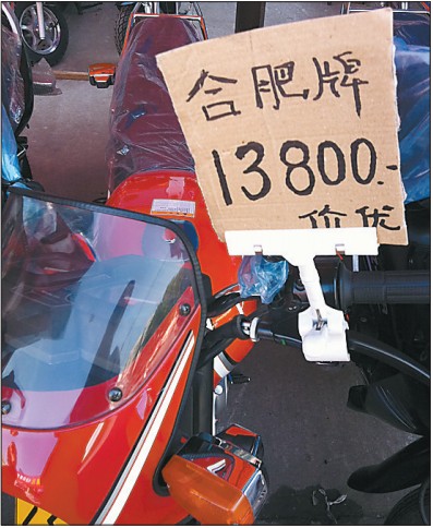 在一家摩托車銷售店的門前,記者看到了一輛掛有“特賣價”牌子的全新摩托車,上面寫著“合肥牌13800”,摩托車周圍不少人都在向老板咨詢購車事宜。