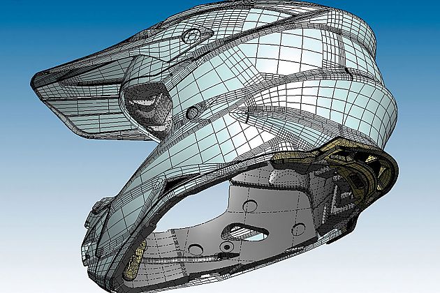 樹脂以液態(tài)注入頭盔外殼模具機(jī)器,通過子母模具的擠壓成型。每一副頭盔模具針對不同尺寸同樣經(jīng)過CAD/CAM模型設(shè)計,用于制造頭盔的模具都有使用周期,每推出一款新頭盔就要淘汰一批模具。從注入到成型,每一個頭盔模具用時大約60秒鐘,之后就進(jìn)入了下一步,打磨、噴涂、貼花。然后安裝面罩,對面罩進(jìn)行防劃、防霧處理。