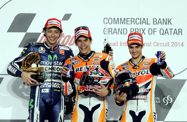 3月23日,萊普索爾本田車隊(duì)西班牙車手馬奎茲(中)、雅馬哈車隊(duì)意大利車手羅西(左)和萊普索爾本田車隊(duì)西班牙車手佩德羅薩在頒獎(jiǎng)臺(tái)上合影。當(dāng)日,在卡塔爾魯塞爾國(guó)際賽道進(jìn)行的2014年世界摩托車錦標(biāo)賽揭幕站MotoGP級(jí)別決賽中,馬奎茲以42分40秒561的成績(jī)奪得冠軍,羅西以42分40秒820的成績(jī)獲得亞軍,佩德羅薩以42分43秒931的成績(jī)獲得季軍。