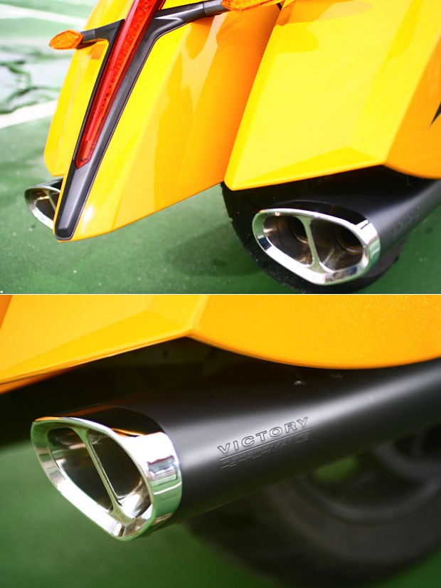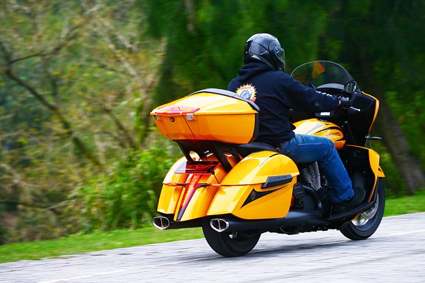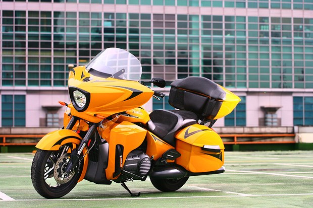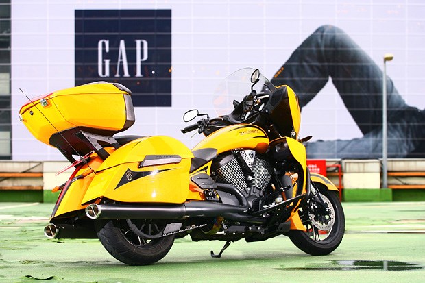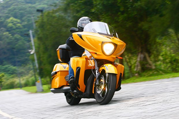 艷黃色的車色、超過兩米七的車長,還有那碩大的前整流罩、后箱與側(cè)箱,在這充滿著小速克達的臺灣道路上,Victory這次派出的代表,Cory Ness Cross Country Tour很是突兀,但另一方面,就是吸睛的絕對。
