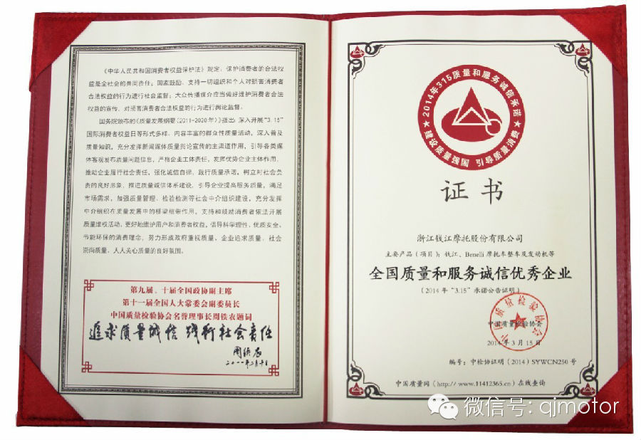 近日,由國家質(zhì)檢總局、中國質(zhì)量檢驗(yàn)協(xié)會主辦的2014年“全國質(zhì)量和服務(wù)誠信優(yōu)秀企業(yè)”評選活動圓滿結(jié)束。經(jīng)過權(quán)威專家層層嚴(yán)格專業(yè)審核,浙江錢江摩托股份有限公司在由中國質(zhì)量檢驗(yàn)協(xié)會組織的專項(xiàng)調(diào)查匯總和專題宣傳活動中,被評選為2014年度“全國質(zhì)量和服務(wù)誠信優(yōu)秀企業(yè)”,并獲頒榮譽(yù)證書。