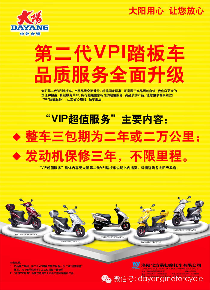 服務(wù)升級(jí):實(shí)行全面超越國家“三包”標(biāo)準(zhǔn)的超值VIP服務(wù):第二代VPI踏板車整車三包期為二年或二萬公里;發(fā)動(dòng)機(jī)保修三年,不限里程;部分零部件在一年或一萬公里內(nèi)實(shí)行三包。