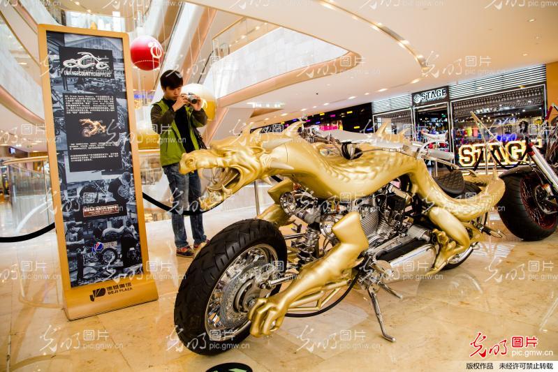 2014年4月4日,江蘇省南京市,“龍版”特別款橘郡工坊(Orange CountyChoppers,簡(jiǎn)稱OCC)機(jī)車吸引,這款機(jī)車長(zhǎng)約2米,車身環(huán)繞著一條“金龍”,龍首雄威、龍爪雄勁,霸氣十足,以中西合璧的元素呈現(xiàn)出藝術(shù)、速度和經(jīng)典的精妙配合,該車市場(chǎng)估價(jià)在220-300萬(wàn)之間。