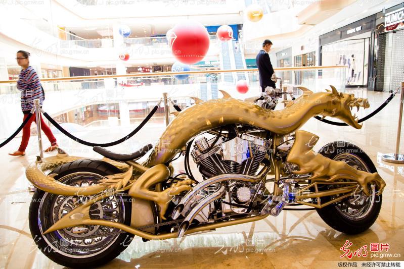 核心提示:2014年4月4日,江蘇省南京市,龍版特別款橘郡工坊(Orange CountyChoppers,簡(jiǎn)稱OCC)機(jī)車吸引,這款機(jī)車長(zhǎng)約2米,車身環(huán)繞著一