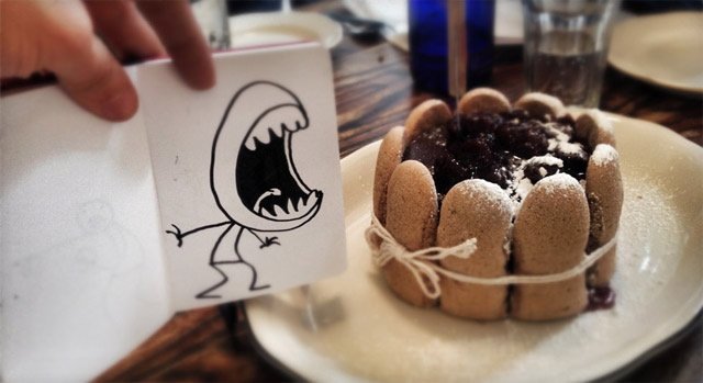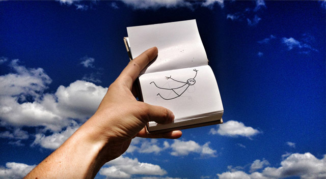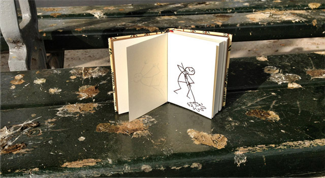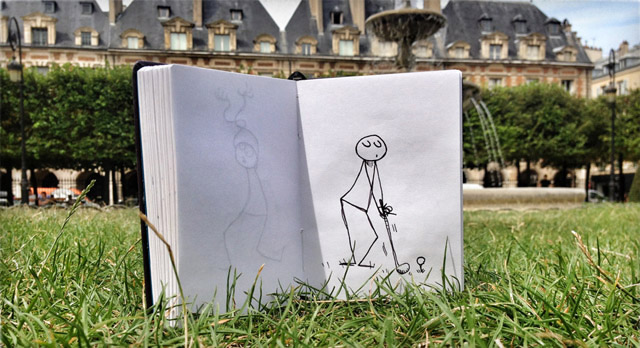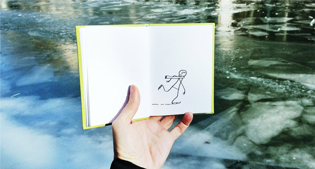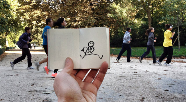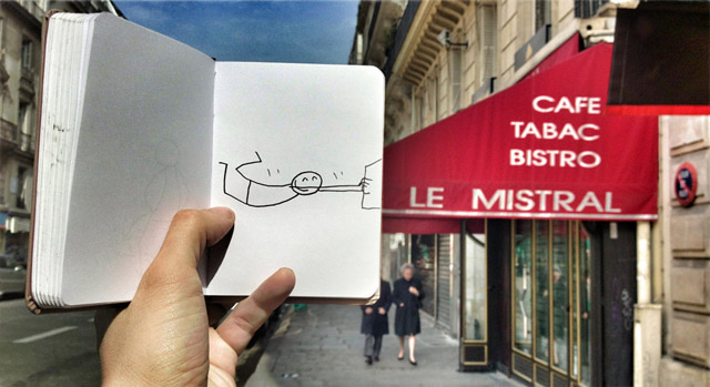 帶上一個小小筆記本踏上旅途,遇見一些場景就即興創(chuàng)作,畫出一個與周圍環(huán)境互動得很high的小人,然后再把它們拍下來。正是因為有這個小人,每一次的定格變得更加幽默。把一個個生動的定格片段組合起來,成就一段特別的旅途。