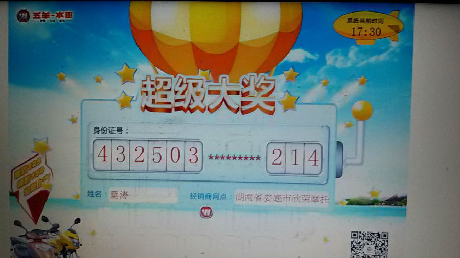 看到這些湖南老鄉(xiāng)中獎(jiǎng)時(shí)的喜悅,你有懷疑嗎?“五一歡樂抽”活動(dòng)截止時(shí)間為5月4日下午5:30,馬上到湖南當(dāng)?shù)匚逖?本田經(jīng)銷商咨詢吧。如果你試了,你會(huì)發(fā)現(xiàn)網(wǎng)絡(luò)抽獎(jiǎng)屏幕滾動(dòng)著自己的名字(而且會(huì)在全國(guó)五羊-本田經(jīng)銷店前同時(shí)出現(xiàn)你的名字哦),銀獎(jiǎng)、金獎(jiǎng)、超級(jí)大獎(jiǎng)隨時(shí)會(huì)在你的名字上定格,然后……恭喜你中獎(jiǎng)了!