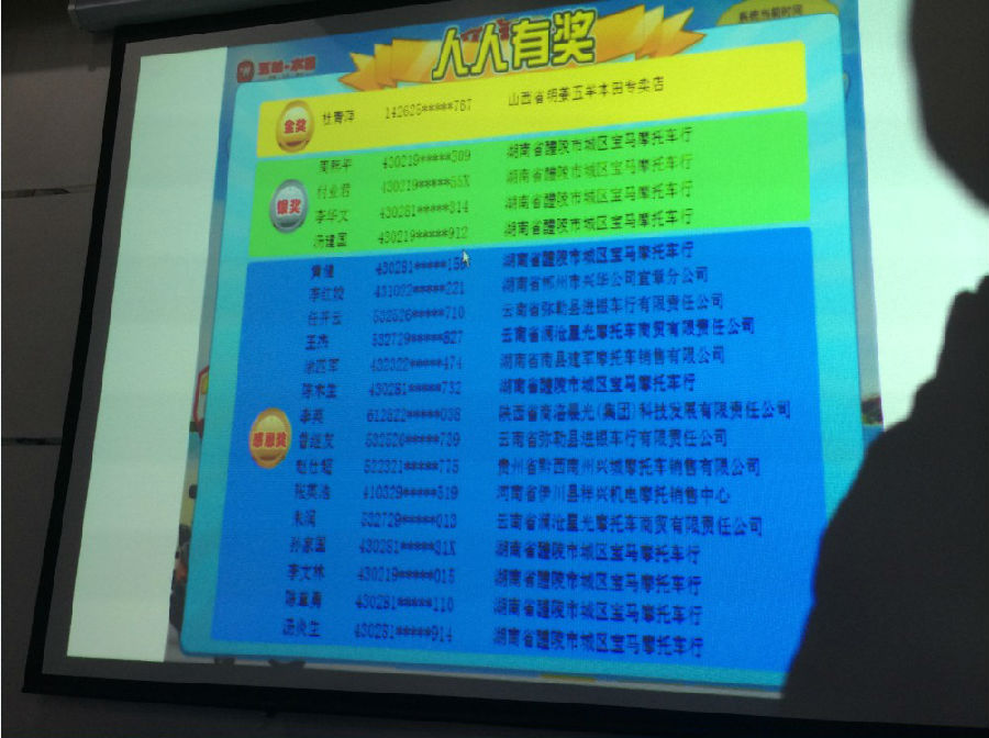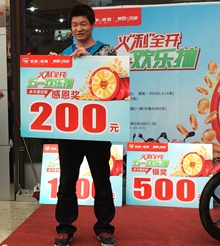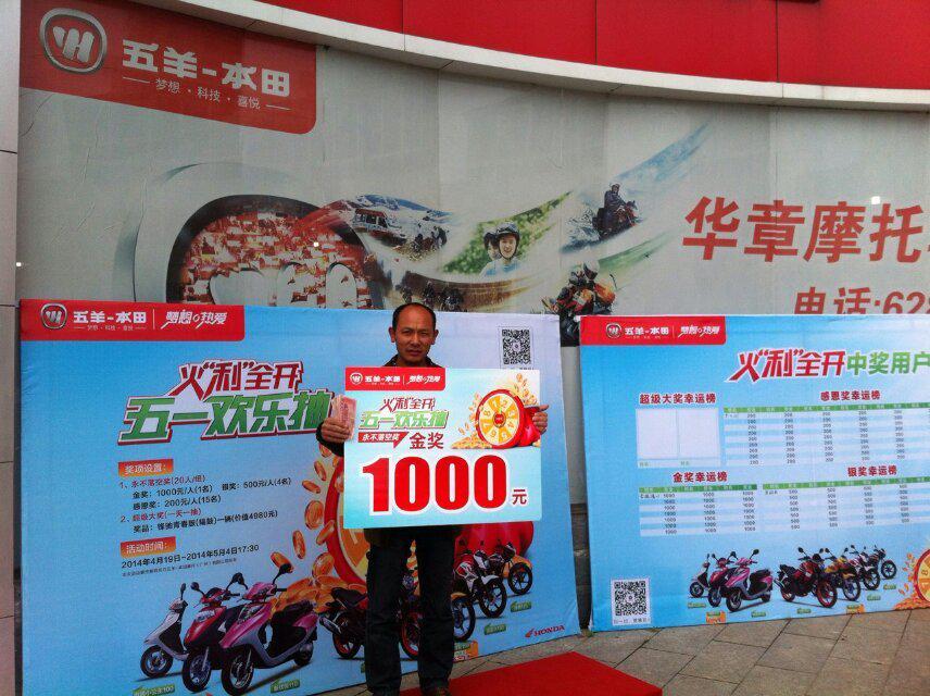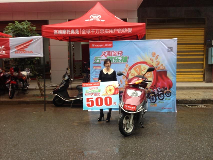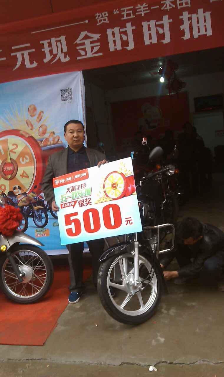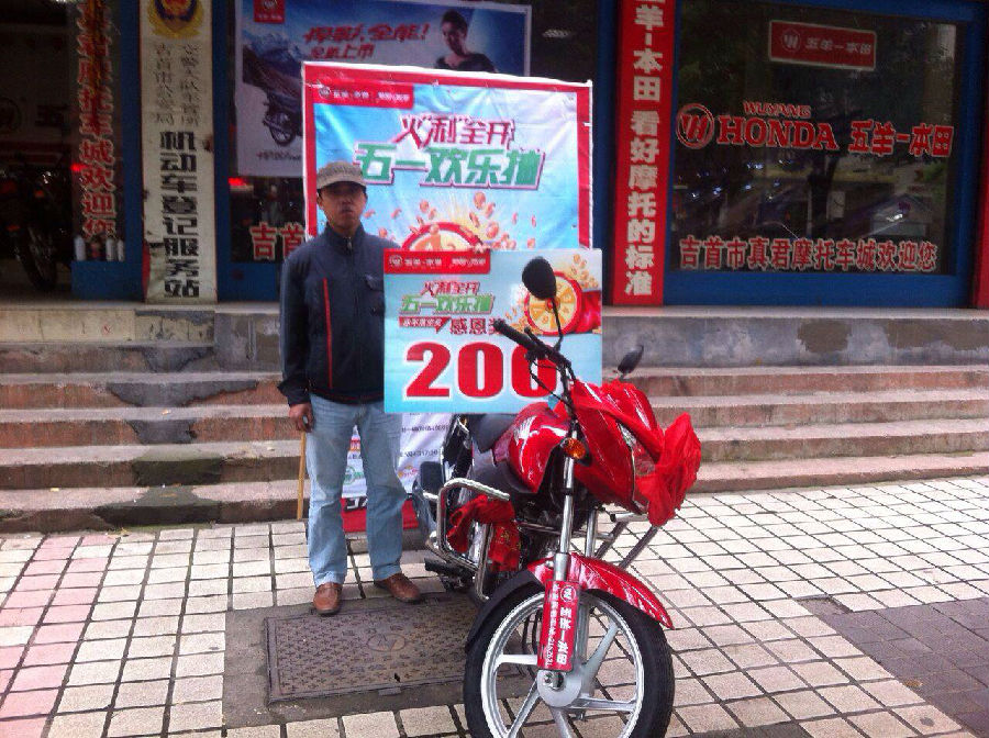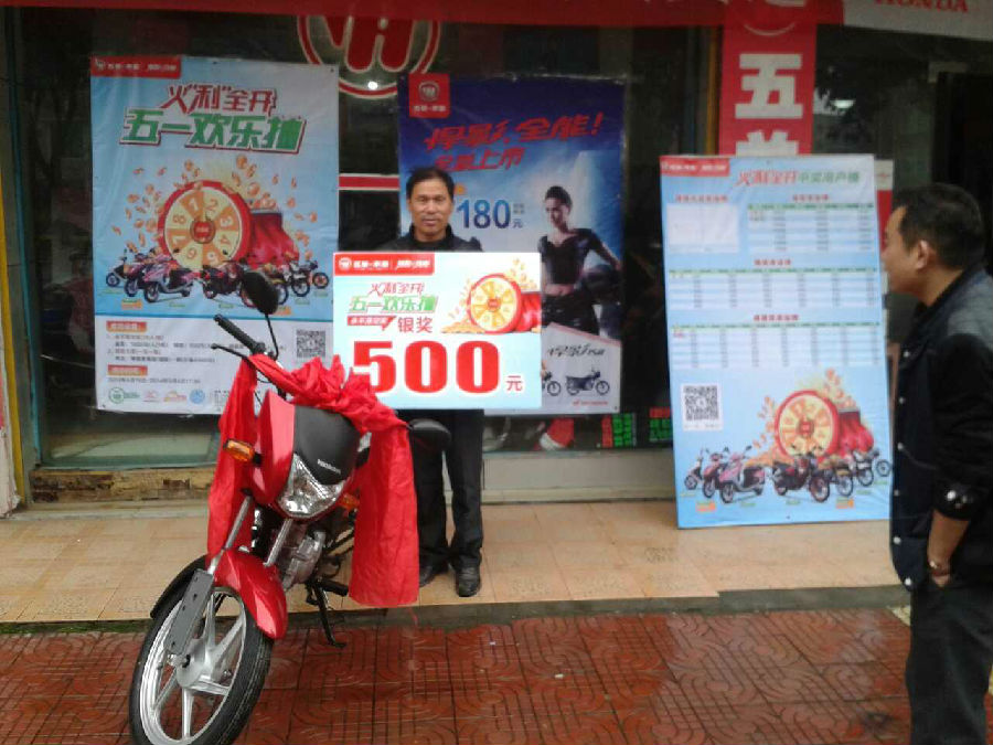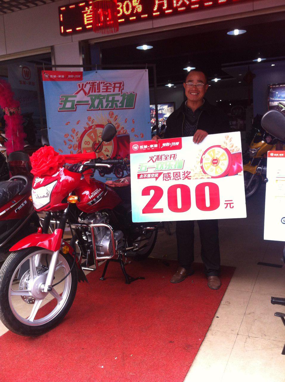 湖南參與抽獎(jiǎng)活動(dòng)單位有40多家,從活動(dòng)開始至29日,每天至少有110位用戶參與了本次抽獎(jiǎng)活動(dòng),其中獲得500元銀獎(jiǎng)的用戶有近290位,其中2位超級(jí)幸運(yùn)用戶更加獲得“摩托車超級(jí)大獎(jiǎng)”(醴陵東堡用戶、婁底漣源用戶)。用購得悍影150的一名用戶的話來說:“買到了好車,享到了優(yōu)惠,還中到了大獎(jiǎng)。買五羊-本田,我樂意,我高興!”。