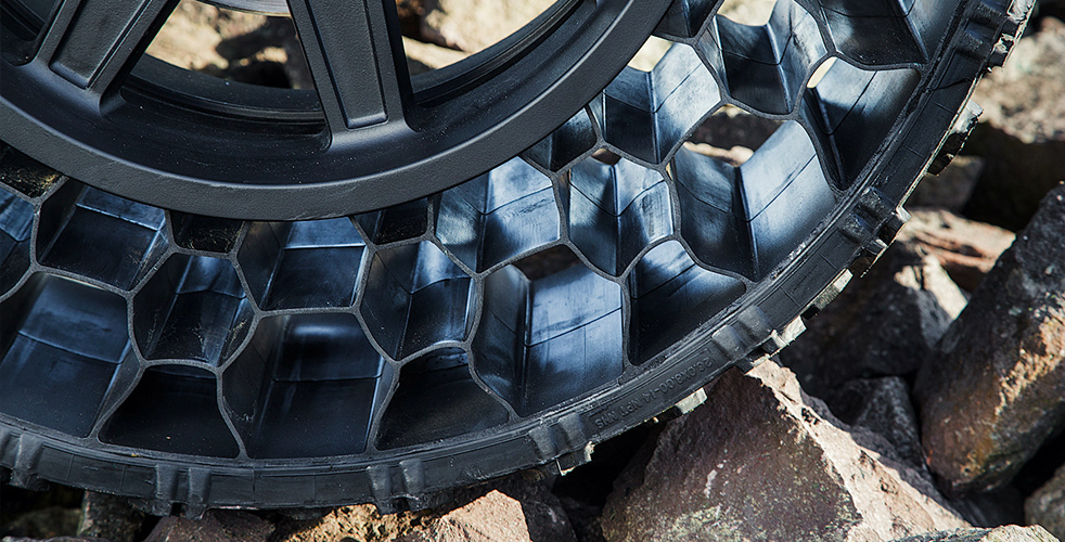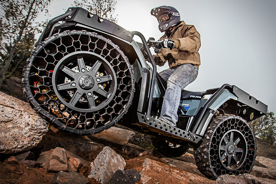 北極星推出全球首款采用非充氣輪胎的全地形越野車Sportsman WV850。非充氣輪胎(Non-Pneumatic Tires)不僅可以省去充氣的麻煩,而且可以應(yīng)對更加復雜的路況,遺憾的是一直沒有商業(yè)化,直到現(xiàn)在。